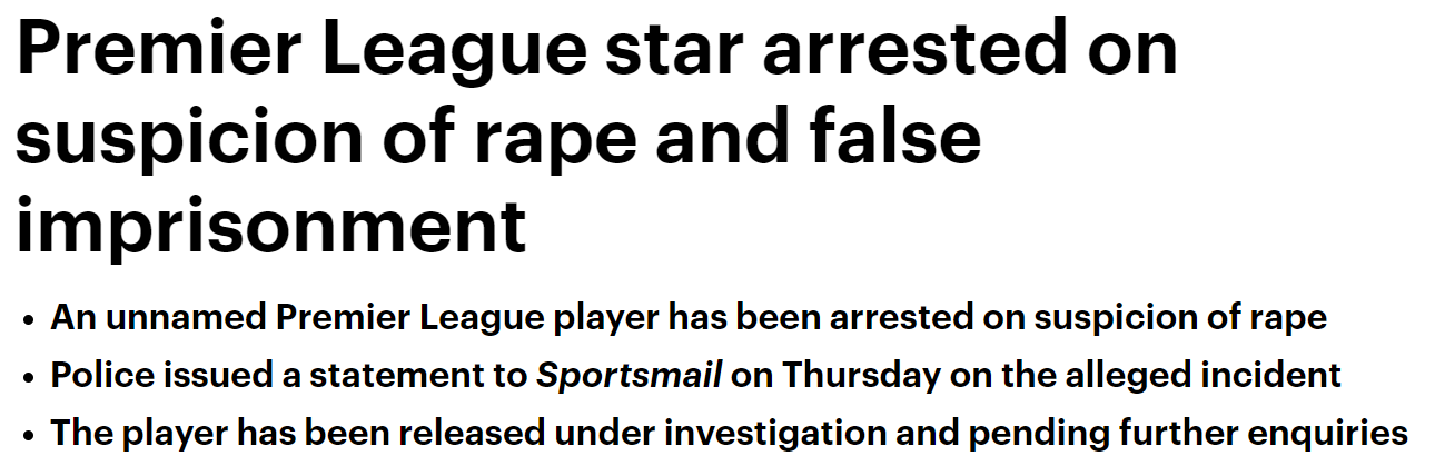 -한 프리미어리그 선수가 불법 감금 및 강간 혐의로 체포되었다.
