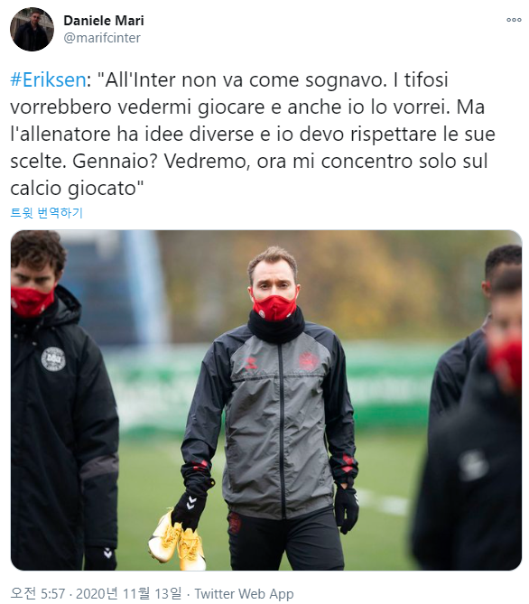 에릭센 : "인테르에서는 내가 꿈꿔왔던대로 상황이 돌아가고 있지 않다. 팬들은 내가 뛰는 걸 보고 싶어하고 나도 그러고 싶다. 하지만 코치는 다른 생각을 하고 있고 나는 그의 생각을 존중해야한다. 1월? 축구에만 집중하겠다."