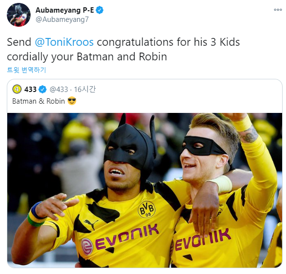 - 이에 오바메양은 배트맨, 로빈 마스크 쓴 사진을 올리며 "토니 크로스한테 배트맨과 로빈이 지켜주는 3명의 아이들이 있다는 것을 축복합니다!"라고 받아침