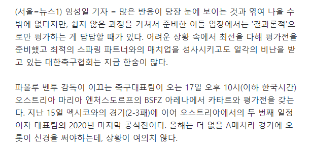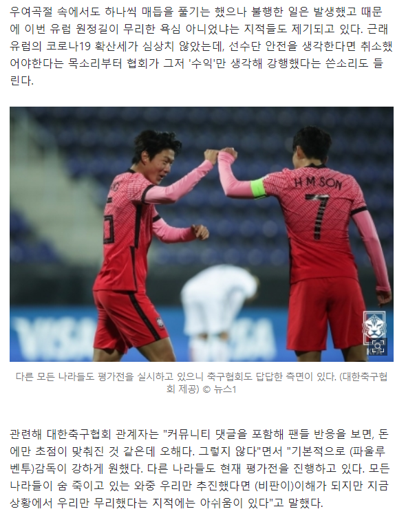 협회 관계자는 "전 세계 국가들이 평가전을 안 하고 있다면 우리가 문제겠지만 다 진행 중이고 같은 장소에서 다른 나라들(일본-파나마 등)도 평가전을 하고 있다. 심지어 유럽은 현재 대회(네이션스리그) 기간"이라면서 "대표팀을 지원하는 협회 입장에서 적어도 1년에 1번은 현지에서 평가전을 치를 수 있도록 준비하고 노력한다. 이렇게 노력하는 게 맞는 것 아닌가 싶다"고 토로했다.
