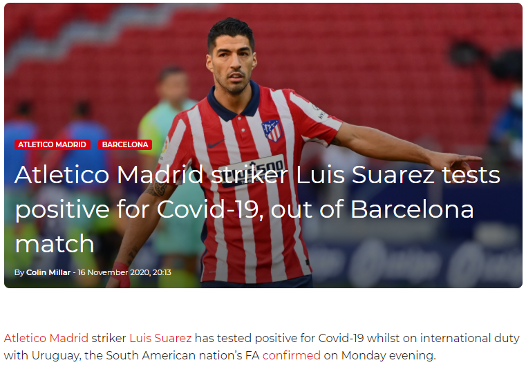 아틀레티코 마드리드의 스트라이커 루이스 수아레즈가 우루과이 대표팀 소집 도중 코로나 테스트에서 양성판정을 받았다. 우루과이 축구대표팀은 공식 성명서를 통해 이 사실을 공표했다. (번역: 에펨코리아_랩터스)