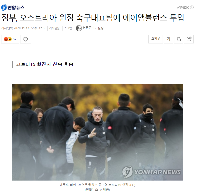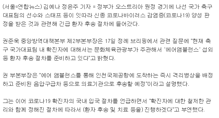 | 축구대표팀 확진자, 에어앰뷸런스로 후송할 예정 | |