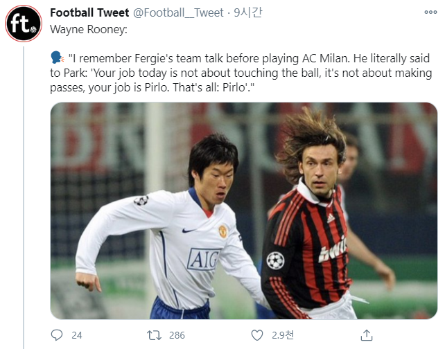 루니: 나는 ac밀란과의 경기 전의 퍼거슨의 팀토크가 기억난다. 퍼거슨은 말 그대로 지성에게 오늘의 일은 볼을 터치하는 것도, 패스를 하는 것도 아니라, 피를로를 맡아라 그게 전부다 라고 말했다 그리고 피를로는 박지성이 그의 명령을 매우 믿을 수 없을 정도로 잘 수행해 주었기 때문에 그 경기에서 40번의 패스도 하지 못했고 95%가 뒤에서만 볼을 찼다고 생각한다.