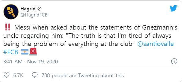 메시는 그리즈만의 삼촌의 자신에 대한 언급에 대해 "나는 내가 항상 클럽의 모든 것의 문제가 되는 것에 지쳤다"라고 답했다.