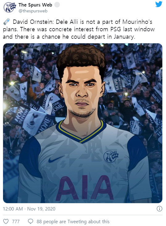 현재 델레 알리는 조세 무리뉴 감독의 계획에 속해있지 않음. 토트넘은 1월에 매각할 계획.