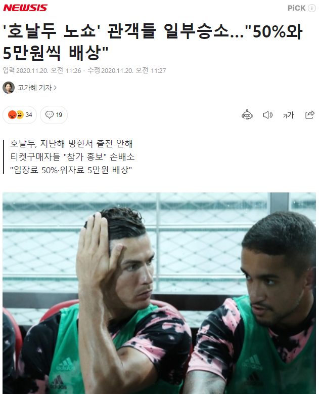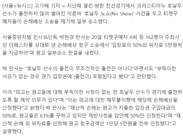 ['호날두 노쇼' 관객 일부 승소.. 입장료 50%와 5만원씩 배상]