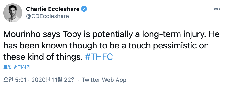 (무리뉴가 부상을 좀 과하게 말하는 경우가 있어서.. 생각보단 빨리 회복하기를 바랍니다)