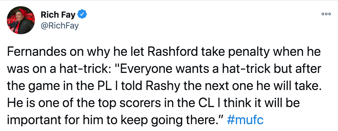 "모두가 해트트릭을 원하죠. 하지만 전 리그 경기를 한 후 다음은 너가 차라고 래쉬에게 말했습니다. 그는 챔피언스 리그에서 탑 스코어러 중 한 명이었고 저는 그 위치에 그가 계속 있는 것이 더 중요하다고 생각했습니다."