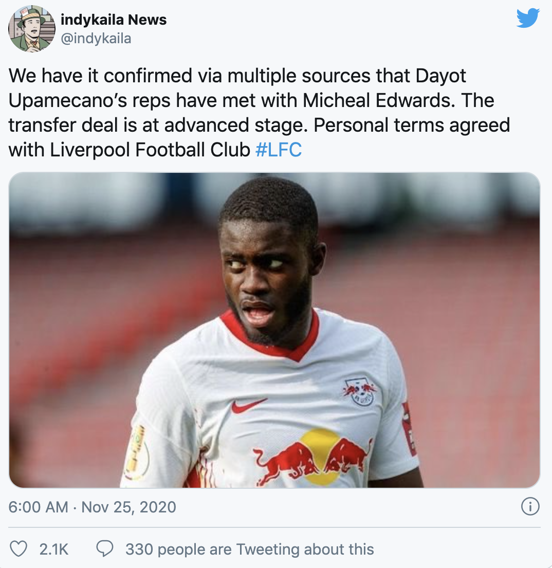 이번 여름 이적시장에서 리버풀 관련 뉴스들에 미친 공신력 보여주며 떡상한 인디카일라!! 우파메카노의 에이전트가 리버풀의 마이클 에드워즈와 만남을 가졌다는 소식을 확인했다. 리버풀과 우파메카노의 개인합의는 완료.