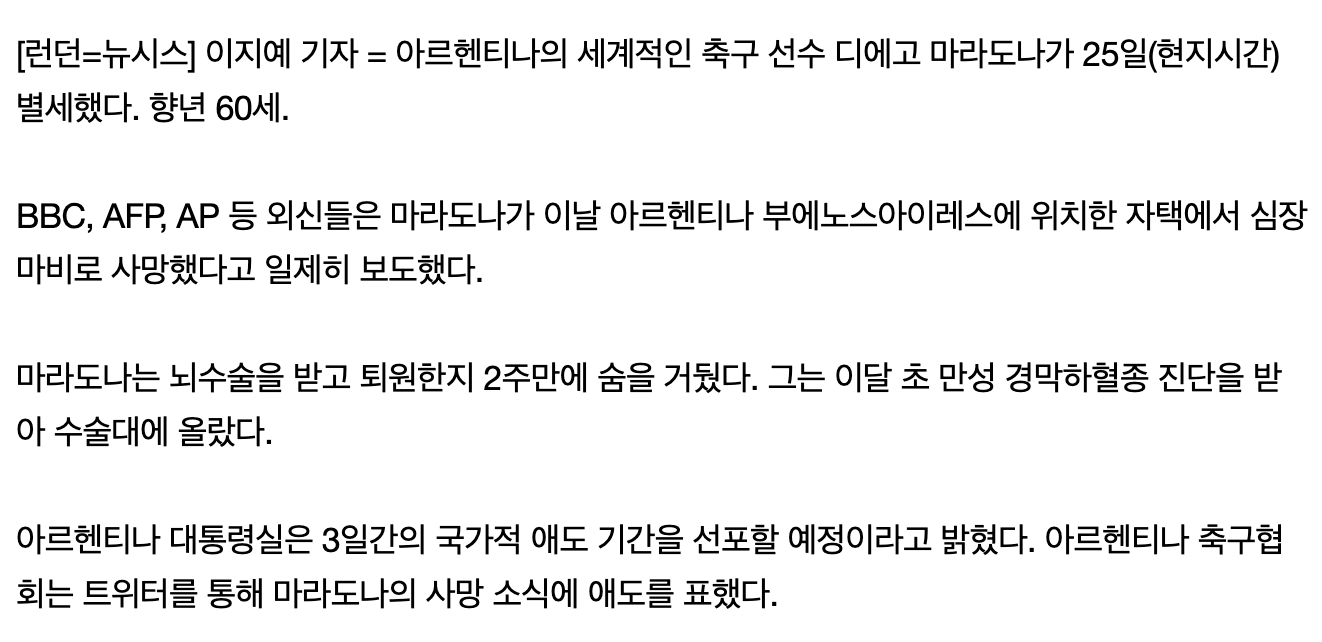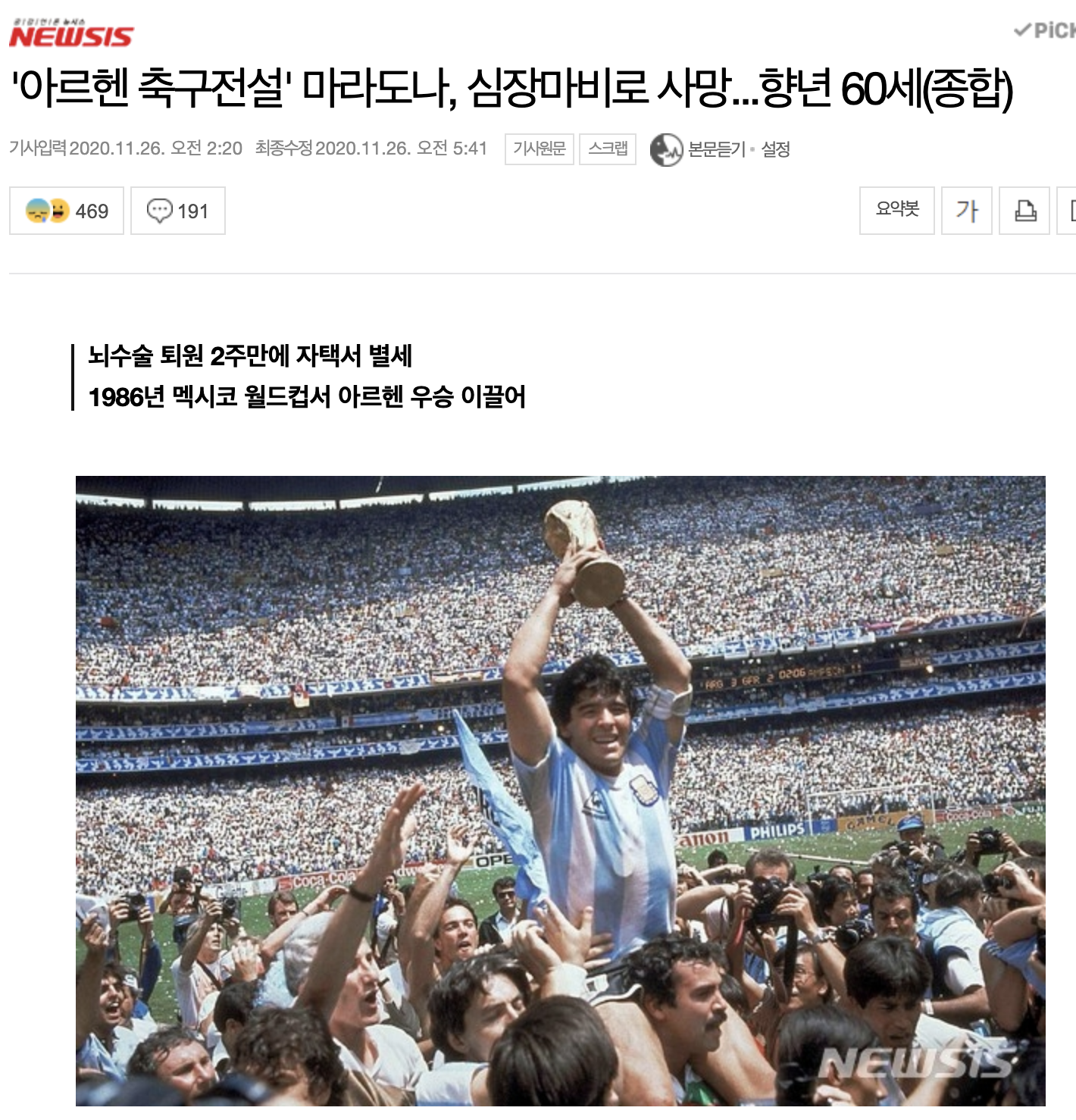 | '축구전설' 마라도나, 심장마비로 사망 | |