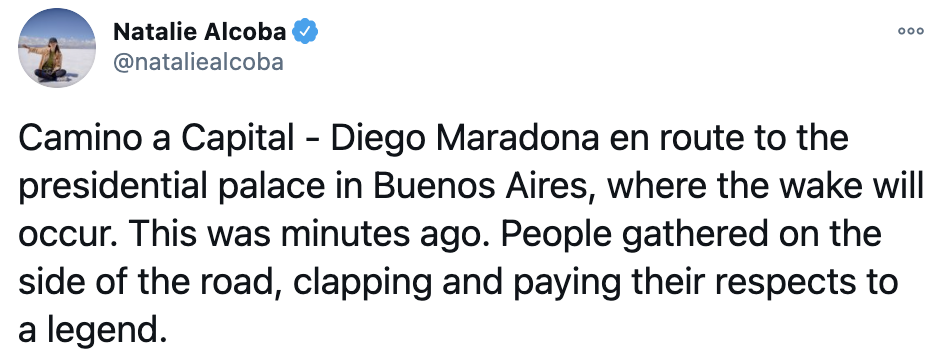 마라도나는 대통령 궁에 안치될 예정이며 아르헨티나는 3일간 국가 애도기간을 선포함. 국민들은 길가에 서서 떠나는 국민 영웅에게 박스를 보냈다고 합니다..