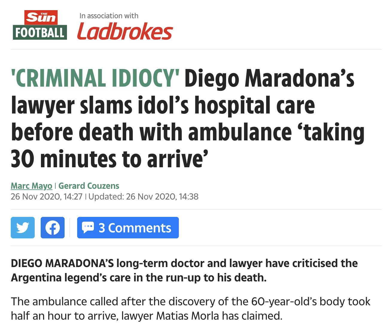 출처 : https://www.thesun.co.uk/sport/football/13306645/diego-maradona-dead-lawyer-ambulance/
