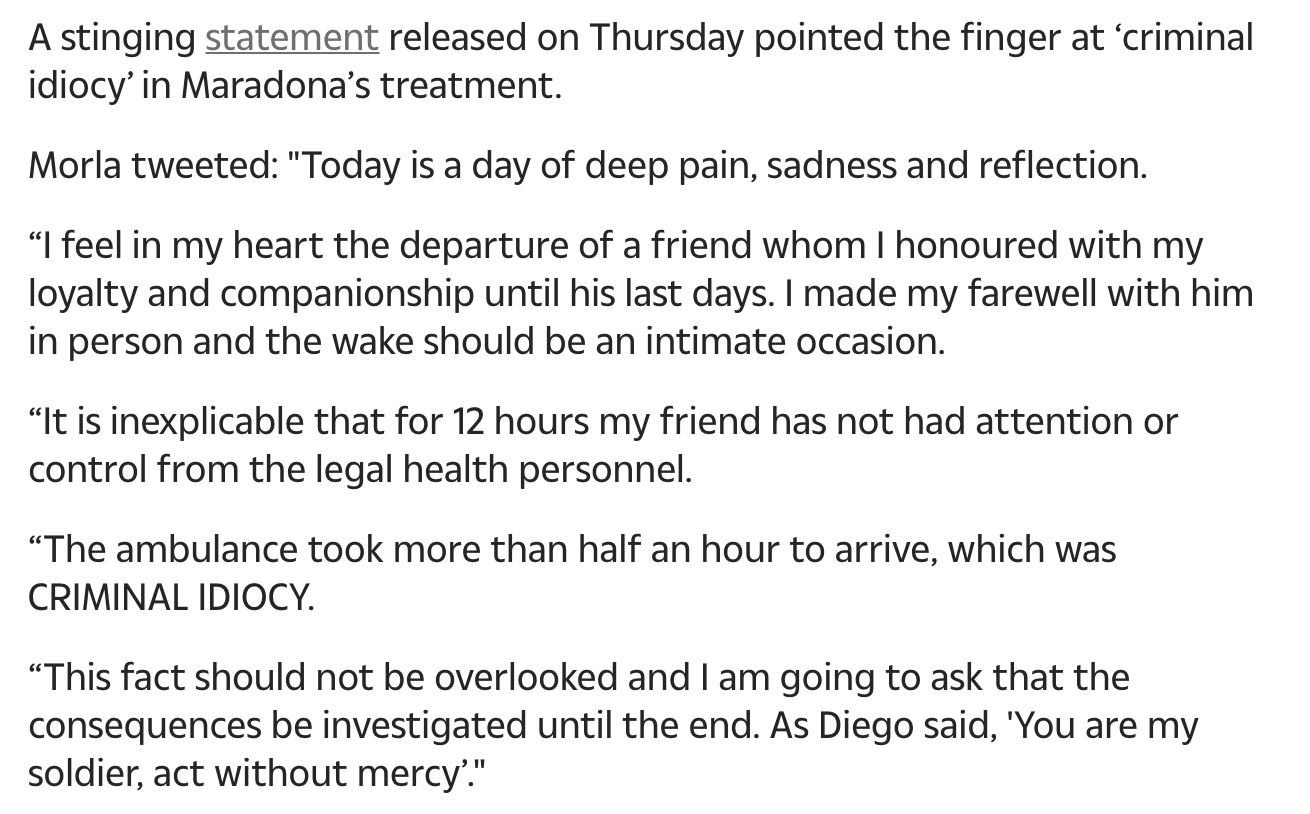 마라도나의 변호사 마티어스 몰라의 주장에 따르면 앰뷸런스가 마라도나의 위독한 상태를 발견한 지 30분이나 지나서야 도착했다고 한다. 현지 시각 목요일 발표된 성명에선 치료 후 마라도나의 관리에 대한 의료 과실을 지적했다.