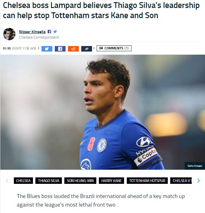 프랭크 램파드 첼시 감독은 23일 토트넘과 경기에서 티아고 실바의 경험과 리더십이 고공행진을 하고있는 듀오 해리 케인과 손흥민을 멈추게 할 수 있을 것으로 보고 있다.