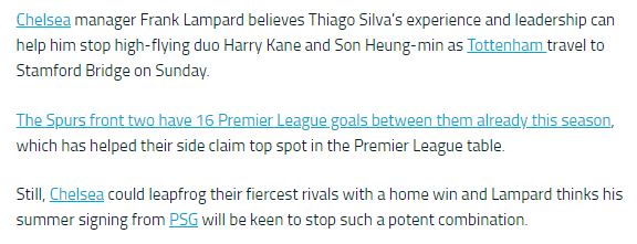 [램파드: "티아고 실바가 손흥민과 케인을 멈출 수 있을 것."]