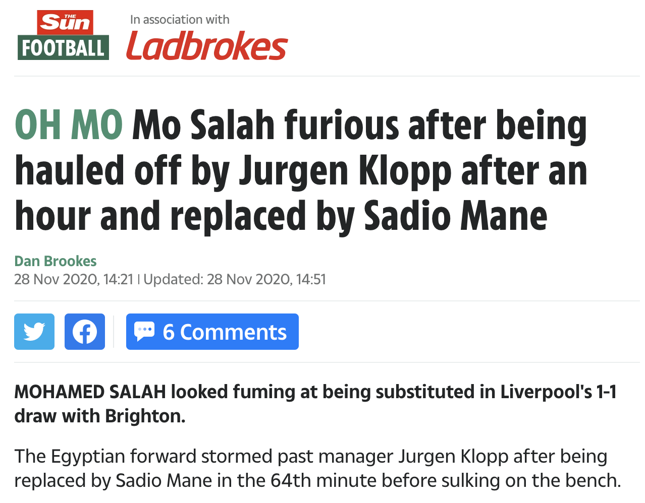 출처 : https://www.thesun.co.uk/sport/13323920/mo-salah-substitution-jurgen-klopp-sadio-mane-brighton/