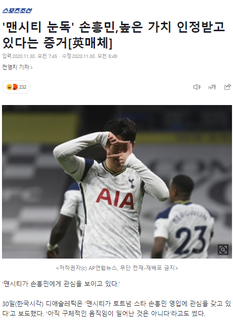 이 매체에 따르면 맨시티는 손흥민을 향한 존경의 시선을 던졌고, 손흥민을 맨시티 공격력을 향상시킬 주요 옵션으로 파악하고 있다. 하지만 펩 과르디올라 감독이 손흥민을 데려오겠다는 확실한 액션을 취한 것은 아직 아니라고도 썼다.