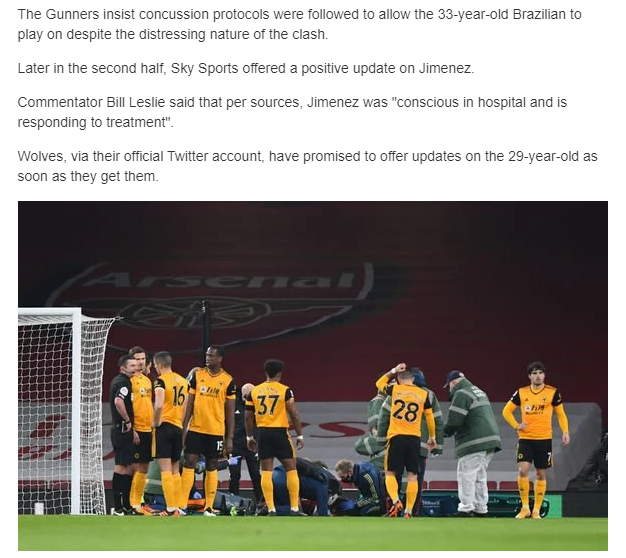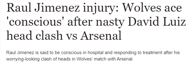 스카이스포츠는 라울 히메네즈는 일요일 프리미어리그 경기에서 다비드 루이즈와 머리 충돌 이후 병원에 이송되었고, "이후 의식이 돌아왔으며 치료 효과가 나타나고 있다"고 보도했다.