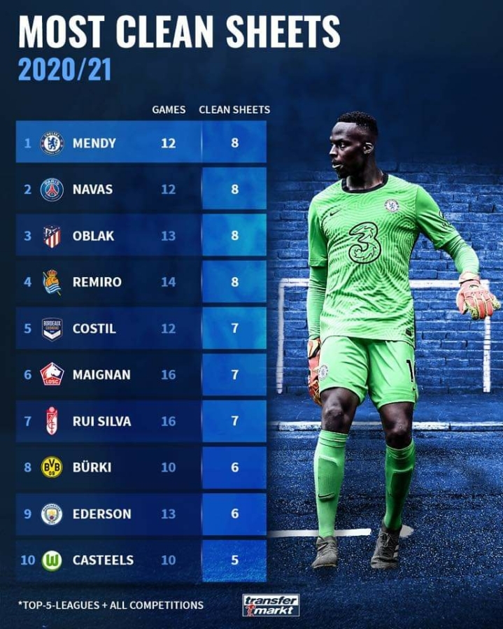 20/21 시즌 현재 최다 클린시트 골키퍼 TOP 10