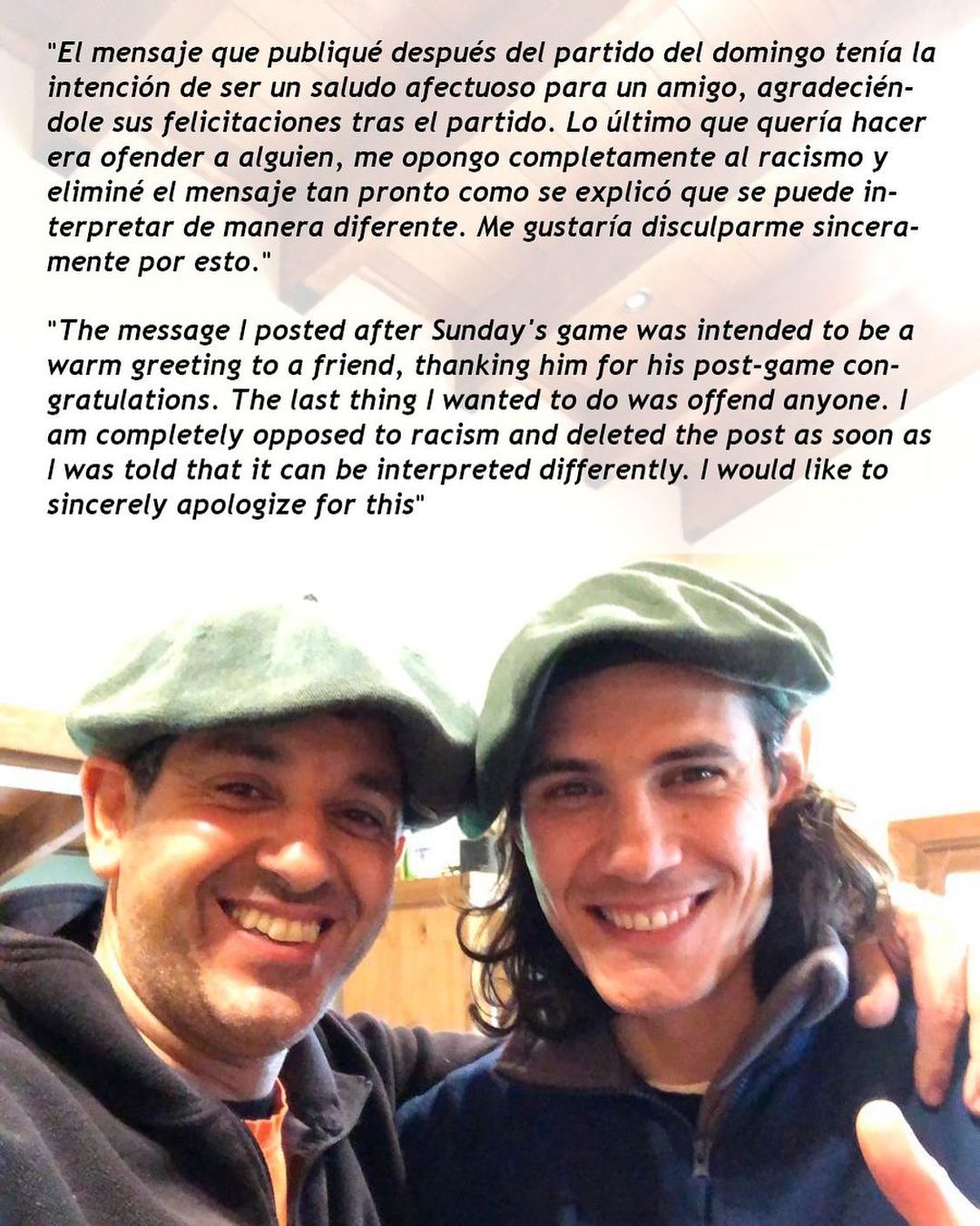 일요일 경기 후 내가 올린 메시지는 내 친구에게 경기 후 축하해줘서 고맙다는 따뜻한 인사였습니다. 내가 마지막으로 말하고 싶은건 어느누구에게도 공격하려는 의도는 없었다는 것이다. 나는 인종 차별에 완전히 반대하고, 내가 한 말이 다르게 해석 될 수 있다는 말을 듣 자마자 게시물을 삭제했습니다. 진심으로 사과드립니다.