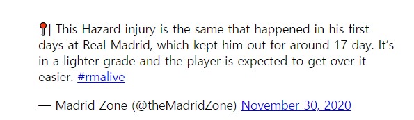 아자르의 부상은 레알 마드리드에서의 첫날에 발생한 것과 동일하며, 약 17일 동안 아웃이었다. 이번 부상은 더 가벼운 등급이며아자르는 더 쉽게 극복할 것으로 예상된다.