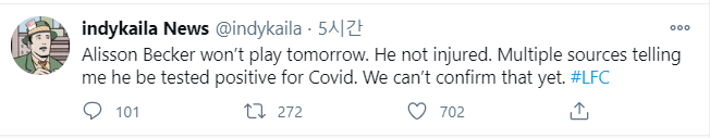 최근 리버풀 공신력 떡상중인 인디카일라가 알리송이 코로나 양성반응이라고 하네요....... 이게 사실이라면 진짜 이번시즌 리버풀은 마가 꼈나.......