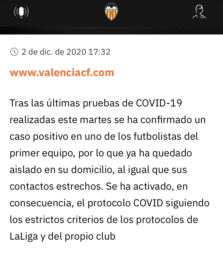 화요일 검사에서 1군 선수 중 한명이 양성반응 확인 지난 주 체리셰프에 이어 발렌시아에서 감염자 발생.