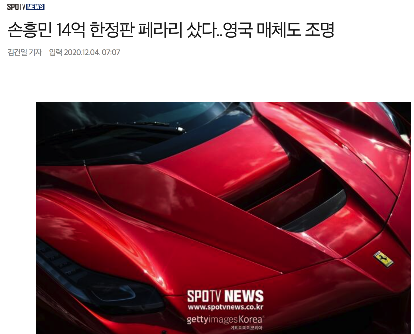 영국 더선은 4일(한국시간) "손흥민의 150만 파운드(약 22억 원)에 이르는 놀라운 자동차 컬렉션엔 100만 파운드(약 14억 원) 짜리 매우 희귀한 페라리 라페라리(Ferrari LaFerrari)가 포함돼 있다"고 보도했다.