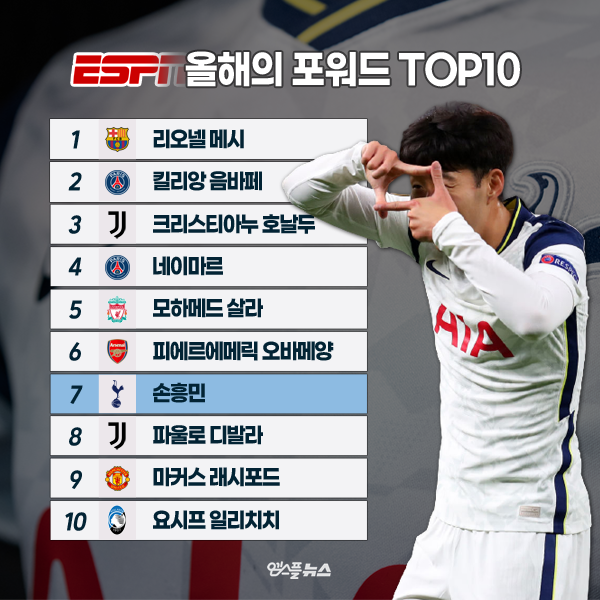 | ESPN 올해의 포워드 TOP10 선정된 손흥민!! | |