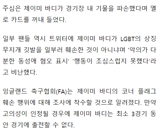 [성소수자 깃발 박살, 제이미 바디의 고의성 인정되면 3경기 출전 금지]