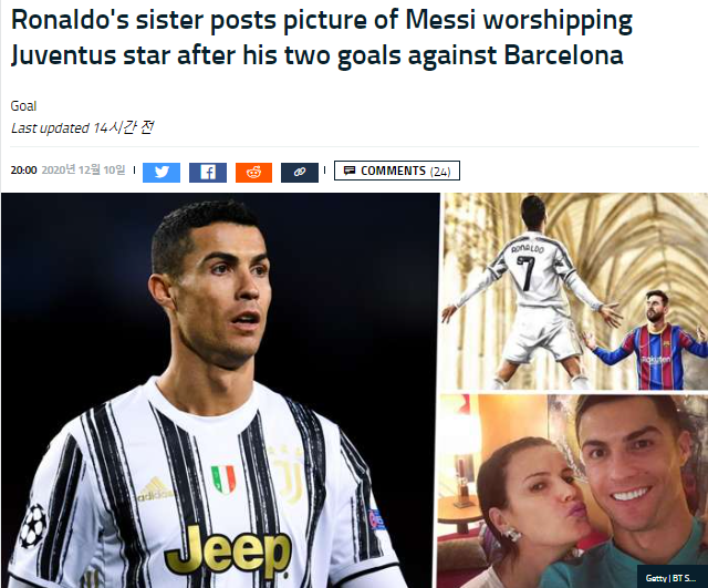 호날두의 누나 Elma Aveiro는 메시가 그의 동생인 호날두를 경배하는 모습이 담긴 사진을 인스타그램에 올렸다.