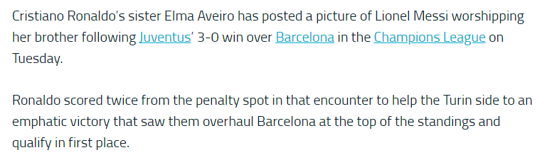 3-0으로 바르샤를 꺾은 경기 이후, 호날두는 메시를 지금껏 라이벌이라고 여기지 않았다고 주장했지만, 그의 누나는 그렇지 않은 것 같아보인다.