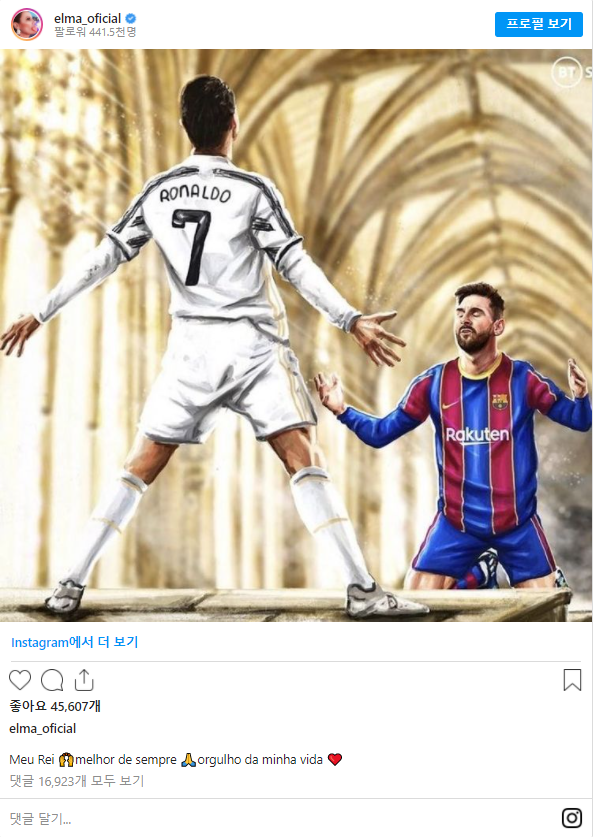 Elma는 "나의 왕. 올타임 레전드. 내 삶의 자랑"이라는 문구와 함께 메시가 호날두 앞에 무릎을 꿇은 사진을 게시했다.