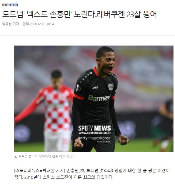 토트넘과 레버쿠젠 거래는 2015년 8월 이후 명맥이 끊겼다. 이때 영입한 선수가 바로 손흥민"이라고 보도했다.