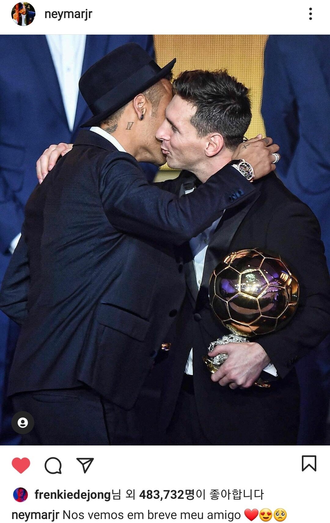메시와의 사진을 올리며 네이마르가 적은 멘트 "조만간 보자 친구야!!"