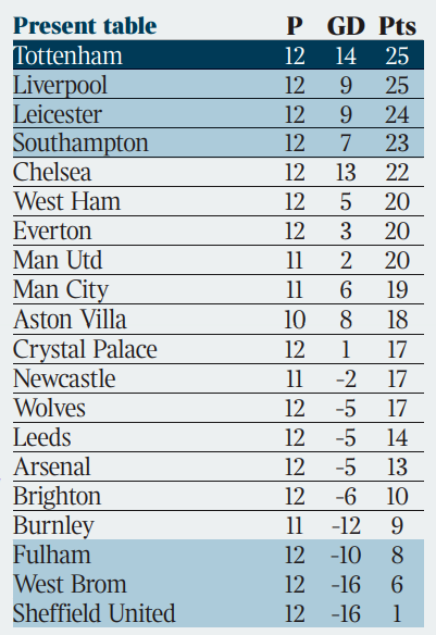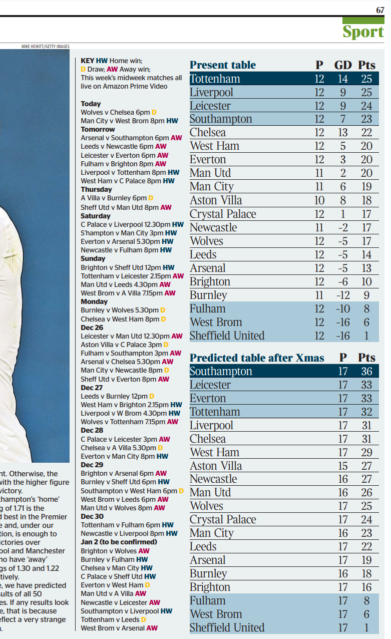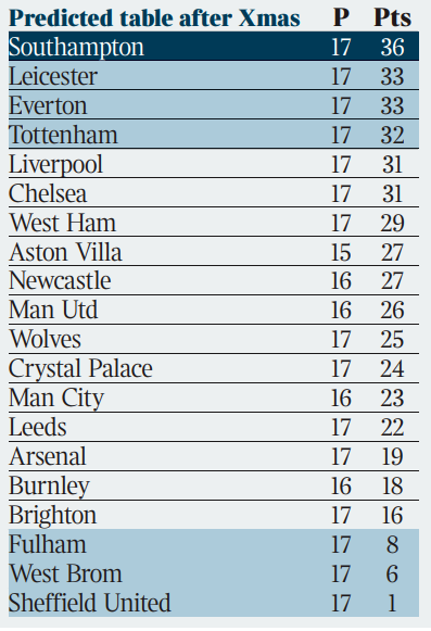 타임즈가 예측한 크리스마스 이후 리그 순위ㄷㄷㄷㄷㄷㄷ