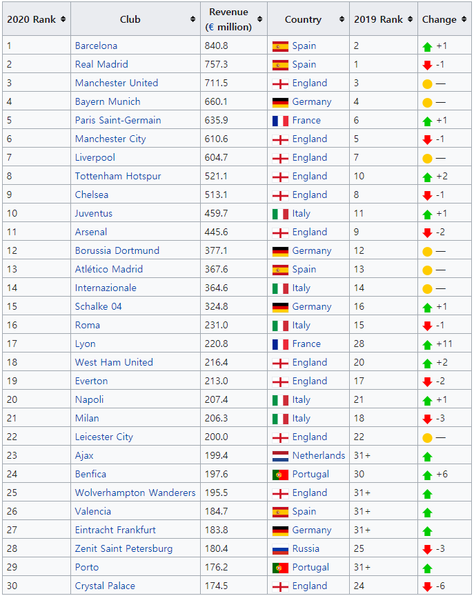 <2020년 축구 구단별 수입> 젤 놀라운게 웨햄 레스터 울브스같은 구단이 밀란 아약스만큼은 번다는거 (링크: Deloitte Football Money League - Wikipedia)