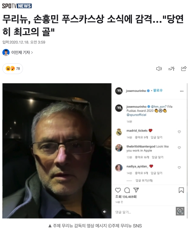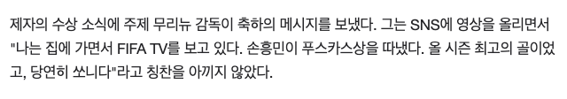 [무리뉴 "푸스카스 수상은 당연히 쏘니!"]