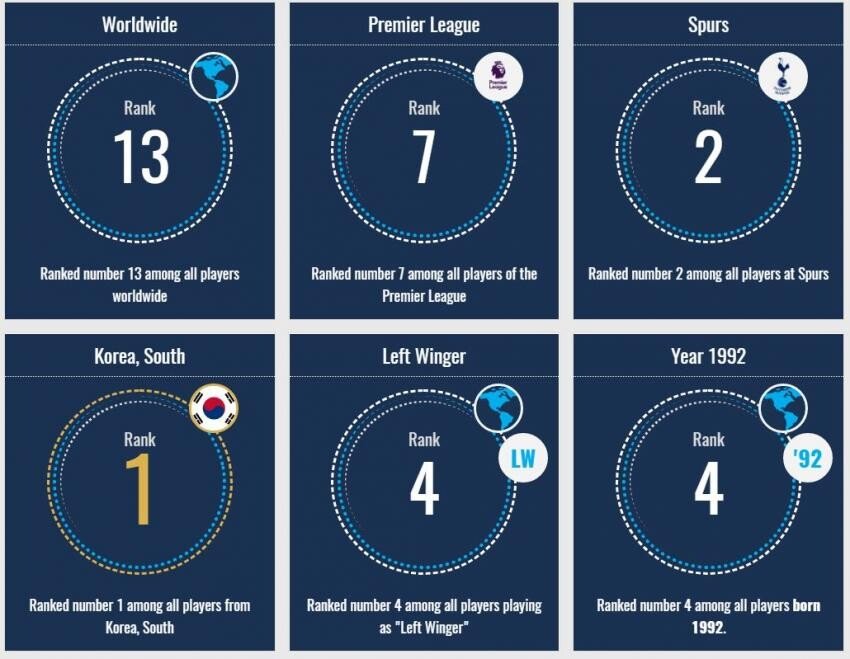 전 세계 13위 / 프리미어 리그 7위 / 토트넘 2위 / 대한민국 1위 / 레프트 윙어 4위 /. 92년생 4위