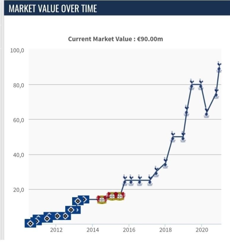 [현재 손흥민의 몸값 수준 및 상승 추이 (트랜스퍼마켓)]