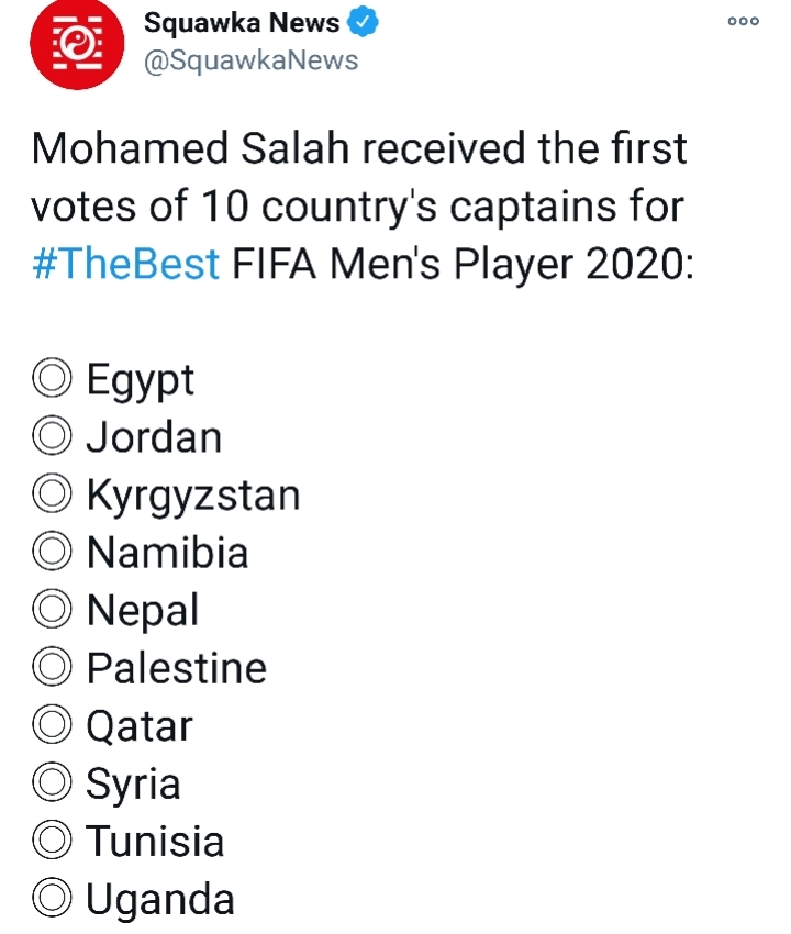 살라의 나라인 이집트를 포함해 위 국가들의 축구대표팀 주장들이 살라에게 투표함. 같은 종교와 이웃 국가들의 살라 챙기기ㅋㅋ (이 정도면 인기 투표 같기도 하고..)