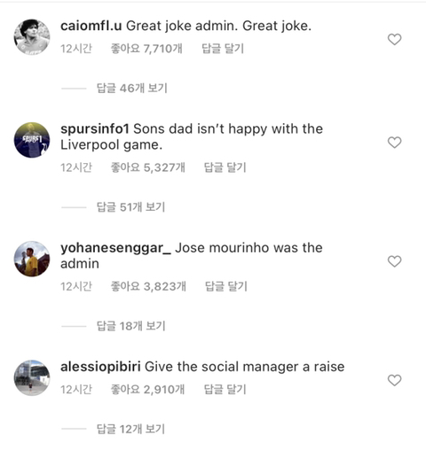 - 공식 계정 조크에 관리자 칭찬. 또한 관리자가 무리뉴 아니냐는 추측 - 아버지가 화나보이는데, 이유는 리버풀전 때문이라는 추측 - 우리는 Heung-min Fan이다!