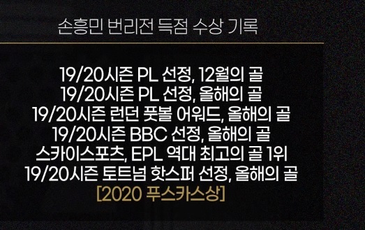 손흥민 번리전 80m 드리블골로 수상한 상들