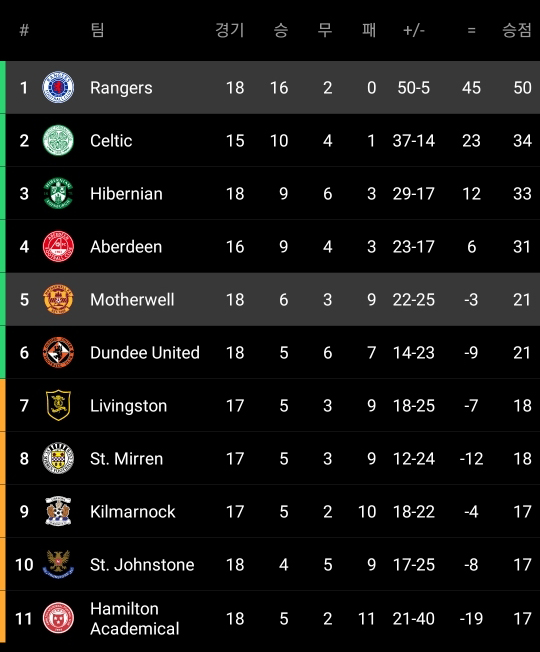 스티븐 제라드의 팀 레인저스는 승점 16점 차이로 리그 1위를 달리는 중ㄷㄷ 무려 16승 2무 0패 (득점 50, 실점 5) 감독이 잘 맞는 듯? 프리미어리그 감독으로 어떻게 입성할 지 벌써 궁금하네요