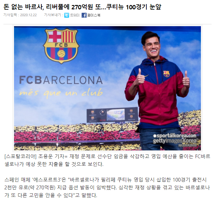 쿠티뉴가 남은 12경기 더 뛰면 옵션(100경기 출장시 추가지급) 발동해서 리버풀에 270억을 더 뜯김ㄷㄷㄷㄷ