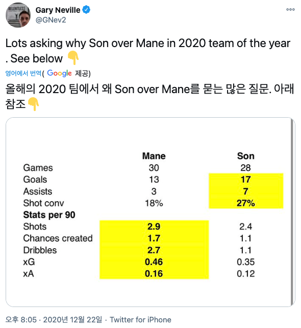 | 네빌이 공개한 '2020년 손흥민이 마네보다 뛰어난 이유' | |