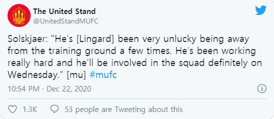 솔샤르 : 린가드는 오랜시간 운이없어 트레이닝장에서 몇번 멀어졌었습니다. 그는 굉장히 열심히 노력하고 있고, 그는 수요일 스쿼드에 확실히 포함될 겁니다.