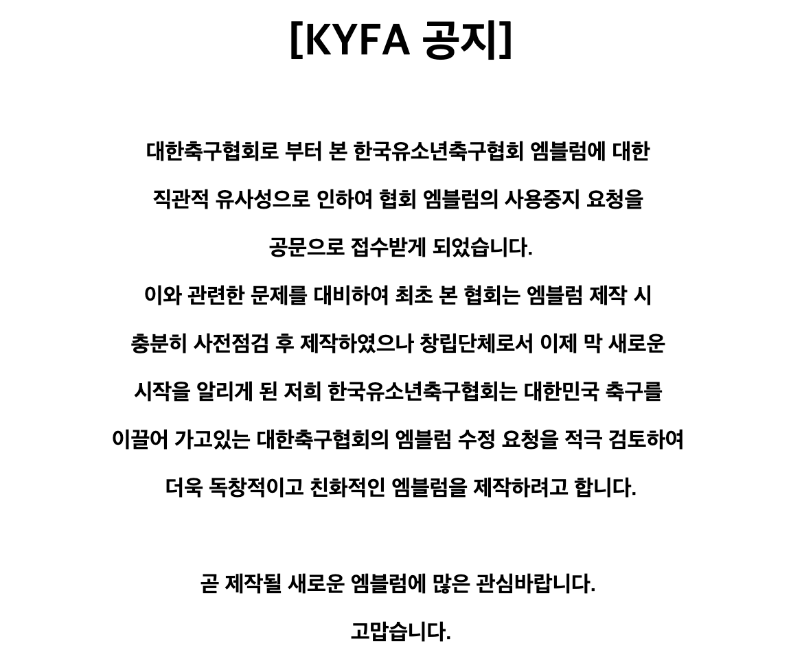 알고 보니 대한축구협회와 아무 관련이 없는 사단 법인이었고 엠블럼 역시 유사하게 만든 거였음ㄷㄷ 대한축구협회에서 엠블럼 수정을 요구한 상태