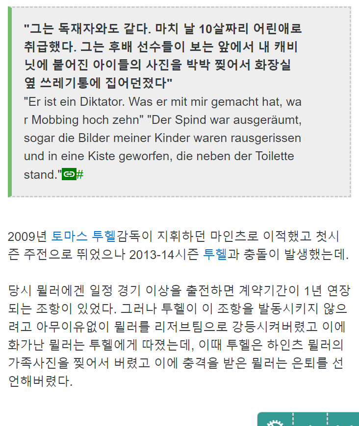바츠케가 투헬이 아무리 인성 파탄이어도 재계약하려고 준비 다 했었다는데 티비에서 투헬이 바츠케가 경기 강행하라고 했다고 말하는 거 보고 두 눈을 의심하고 손절했다고 함