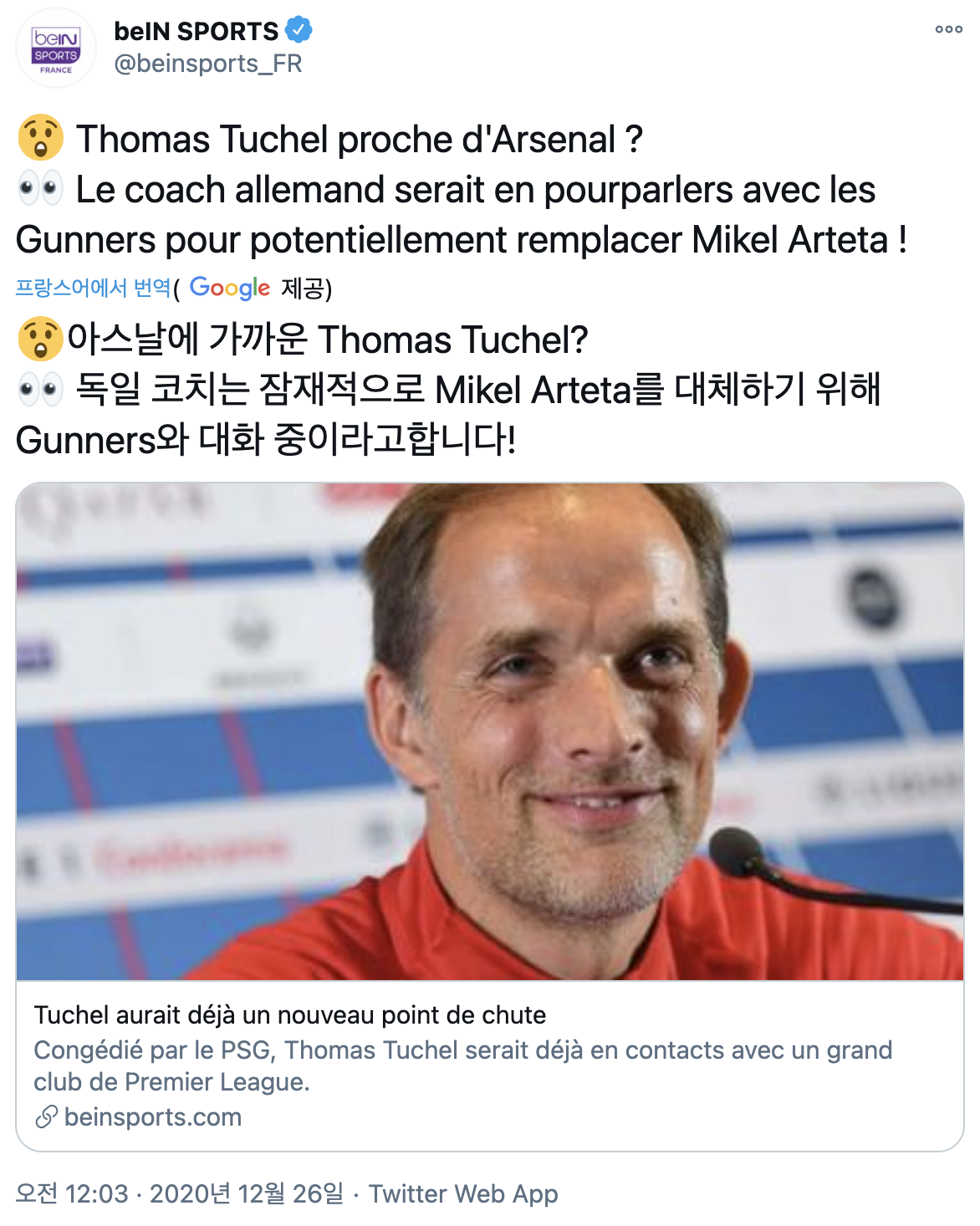 요약 : 투헬은 아스널과 대화 중이고 본인도 프리미어리그에 관심이 있음. 아스널뿐만아니라 맨유도 솔샤르 경질을 대비하여 예의 주시 중임
